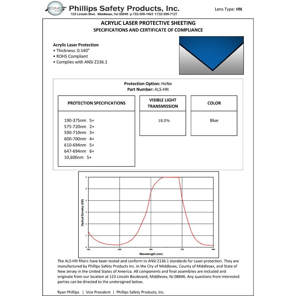 Filter specifications can be permanently engraved on the window. Custom sizes and shapes available. This HeNe Laser Acrylic Sheet meets and/or exceed US ANSI Z136 standards for use with lasers. .150" Thickness