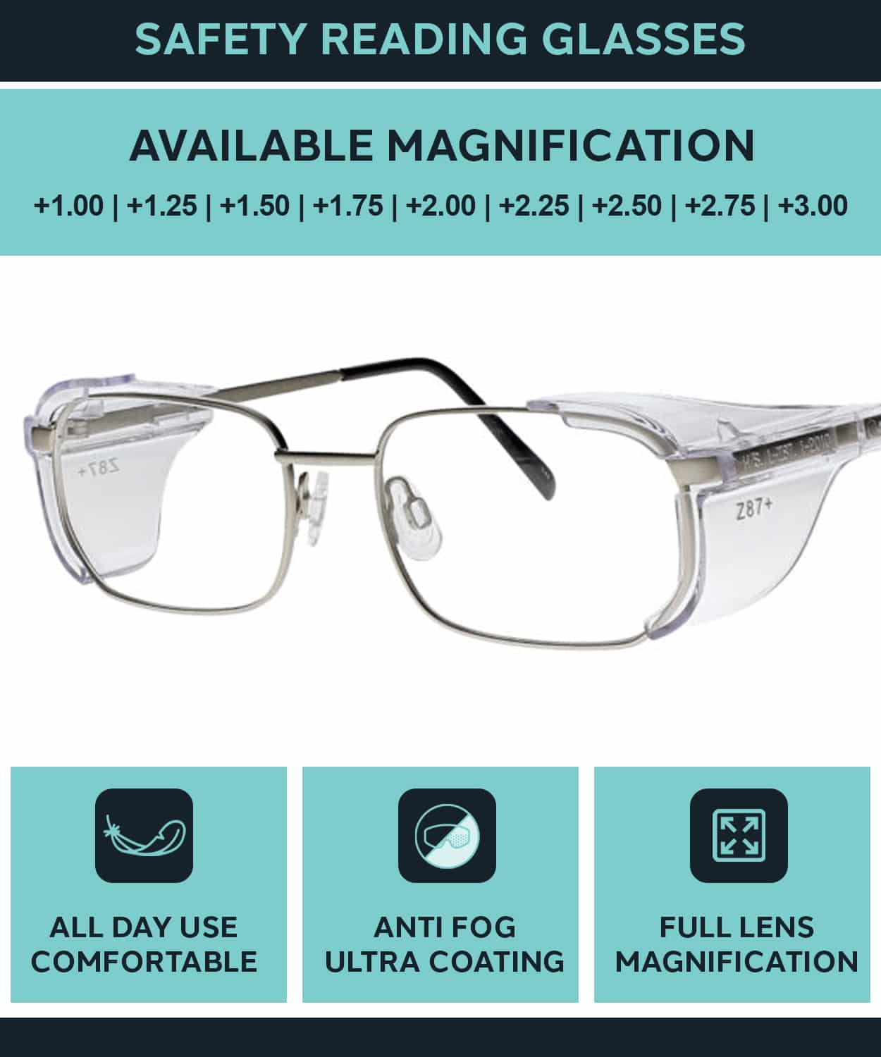 The Safety Reading Glasses 303 is a metal safety frame with anti fog magnifying lenses which reduce fatigue and eye strain. The 303 safety reading glasses feature silicone nose pads for a secure fit. Plus, these lightweight safety reading glasses feature removable side shields for additional lateral protection. The 303 also has exclusive permanent anti fog coating technology, which guarantees that the lenses of these reading glasses will never fog. Available in silver, this is an excellent option if you need reading glasses for work. Additionally, the reading glasses 303 meet rigorous industry standards and are ANSI Z87-2+ and EN 166 F approved for optimal protection.
