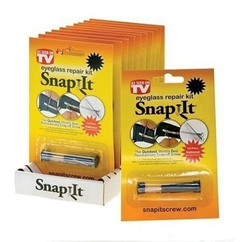 This pocket-size eyeglass repair kit allows you to repair your glasses at anytime-anywhere. These high-quality stainless steel screws have a unique, extra long feeder tab that makes handling screws a cinch and repairs a pleasure. Includes 5 different size Snapit screws and special screw driver. Insert screw into any hinge or eyewire, once tightened, the long feeder tab simply snaps off cleanly with just your fingers leaving a smooth finish. Drop it in, Screw it down, Snap it Off, and you're done!