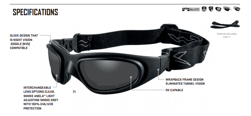 Due to this feature it is ideal for Military/Tactical, Motorcycling, and Skydiving. The Wiley X SG-1 frame fits those requiring Small to Extra Large fitting frames.